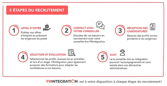 Utilisez la plateforme gratuite FRintegration pour déposer votre annonce d’emploi et recevez des profils pertinents. Vous bénéficierez d’un accompagnement personnalisé pour affiner vos sélections. Des services complémentaires peuvent vous être proposés, tels que le développement des compétences ou la mise en place d'une formation si nécessaire.